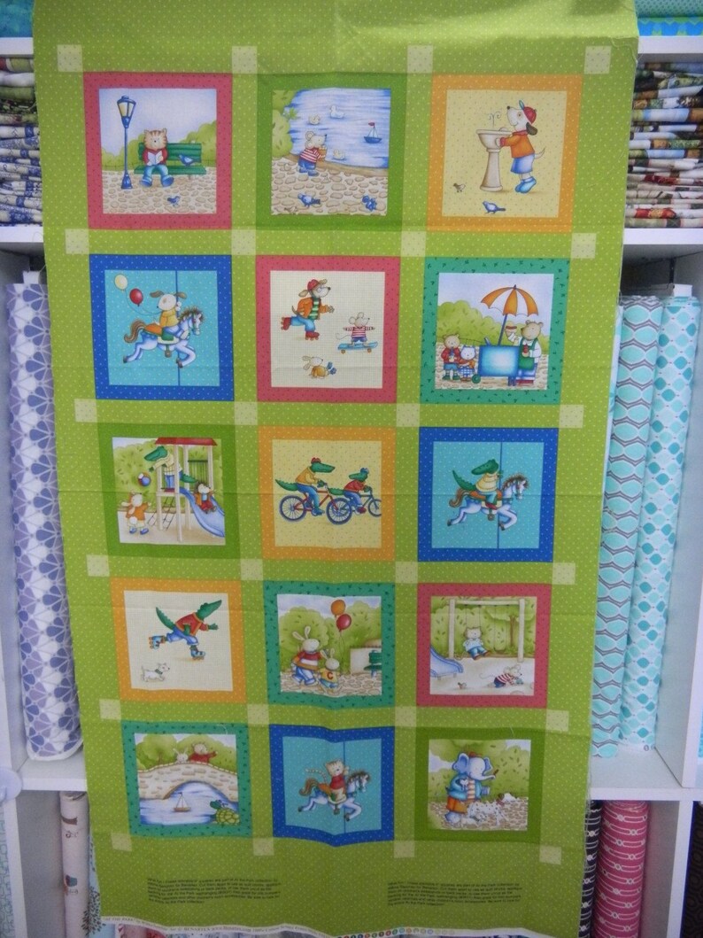 Derzeit habe ich noch einen Kinderquilt in Arbeit. Vor einigen Jahren kaufte ich ein Paneel mit Kindermotiven von Wilma Sanchez und zugehörige Beistoffe aus der Serie „At the Park“. Es gibt zu diesem Quilt eine Anleitung. Damals fand ich sie toll, heute ist sie mir zu unruhig. Zwischen den Motiven befanden sich verschieden bunte Windrad- Blöcke. HIER könnt ihr ein Beispiel sehen.