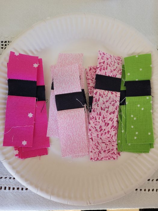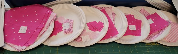 Es hat sich ein Wunschquilt dazwischen geschoben, der keinesfalls zu spät fertig werden darf. Die ersten Tage waren dem Zuschnitt gewidmet, es gibt sehr viele Teile, die ich alle beschriftet habe, dass ich sie nicht verwechsele. Dafür bot das Muster (den Namen gebe ich später bekannt) schon entsprechende Labels, die man nur ausschneiden musste. Zusätzlich habe ich von der Pappteller- Methode gelesen, die eine Sortierung entweder von einzelnen Zuschnitten oder von Teilen eines Blocks möglich macht. Das ist eine gute Basis für effektives Arbeiten. Überhaupt ist das Schnittmuster super gut durchdacht, die Planung geht bis ins kleinste Detail. In dieser Ausführlichkeit habe ich das wirklich selten erlebt. Großes Lob an die Designerin!