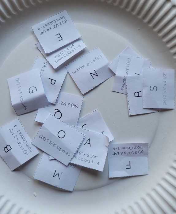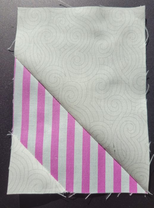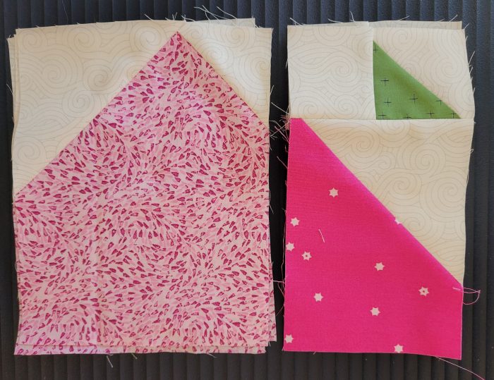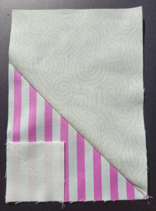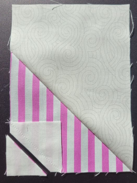 Zusätzlich gibt es den 3. Teil mit dem Schwanz. Es sind mehrere Einzelschritte, bis endlich ein gesamter Block entsteht. Zunächst wird auf ein Rechteck ein großes Quadrat aufgenäht, die Ecke abgeschnitten und umgebügelt.