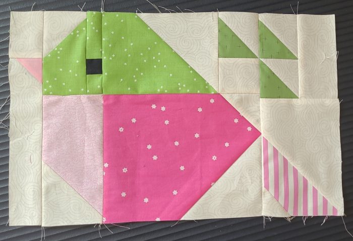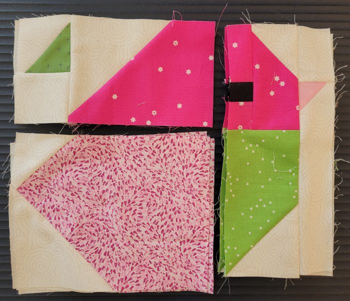 Heute zeige ich, wie der Block zusammengesetzt ist. Hier kommen die zwei Teile der Mitte zueinander, dann wird der vordere Teil angenäht.